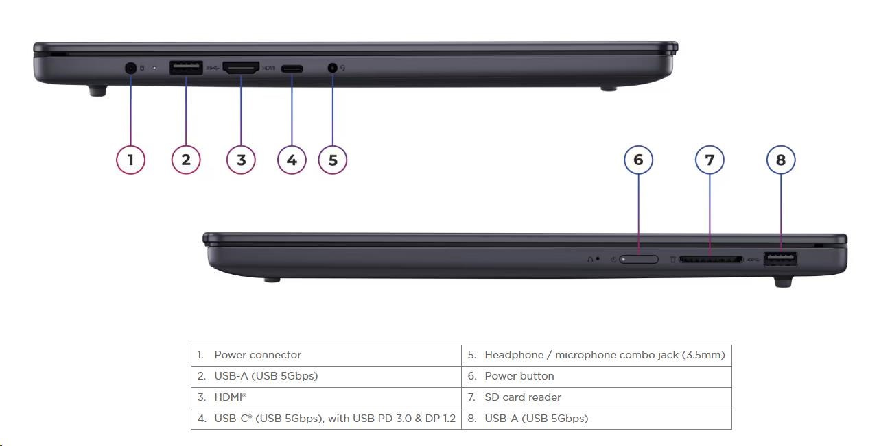 | Standartné porty | 2x USB-A (USB 5Gbps / USB 3.2 Gen 1) 1x USB-C® (USB 5Gbps / USB 3.2 Gen 1), with USB PD 3.0 and DisplayPort™ 1.2 1x HDMI® 1.4 1x Headphone / microphone combo jack (3.5mm) 1x SD card reader 1x Power connector |