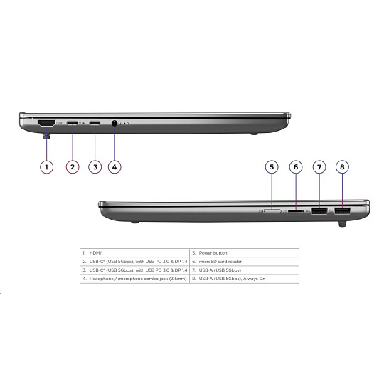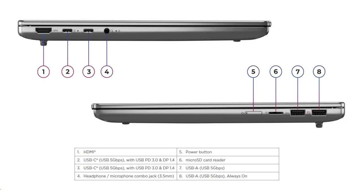 | Standartné porty | 1x USB-A (USB 5Gbps / USB 3.2 Gen 1) 1x USB-A (USB 5Gbps / USB 3.2 Gen 1), Always On 2x USB-C® (USB 5Gbps / USB 3.2 Gen 1), with USB PD 3.0 and DisplayPort™ 1.4 1x HDMI® 2.1, up to 4K/60Hz 1x Headphone / microphone combo jack (3.5mm) 1x microSD card reader |