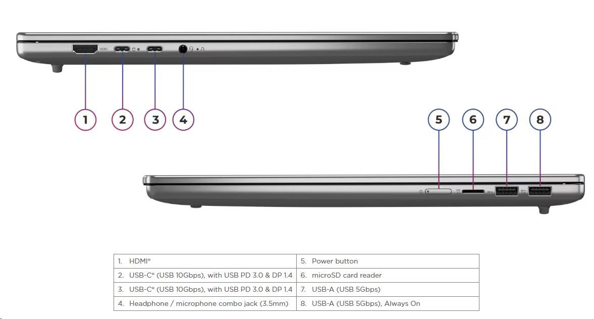 | Standartné porty | 1x USB-A (USB 5Gbps / USB 3.2 Gen 1) 1x USB-A (USB 5Gbps / USB 3.2 Gen 1), Always On 2x USB-C® (USB 10Gbps / USB 3.2 Gen 2), with USB PD 3.0 and DisplayPort™ 1.4 1x HDMI® 2.1, up to 4K/60Hz 1x Headphone / microphone combo jack (3.5mm) 1x microSD card reader |