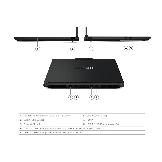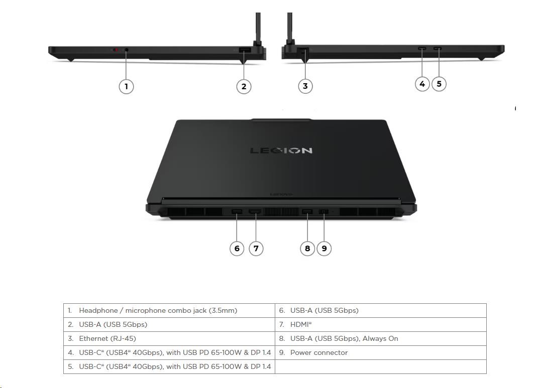 | Standartné porty | 2x USB-A (USB 5Gbps) 1x USB-A (USB 5Gbps), Always On 2x USB-C® (USB4® 40Gbps), with USB PD 65-100W and DisplayPort™ 1.4 1x HDMI® 2.1, up to 8K/60Hz 1x Headphone / microphone combo jack (3.5mm) 1x Ethernet (RJ-45) 1x Slim tip Power connector |