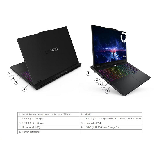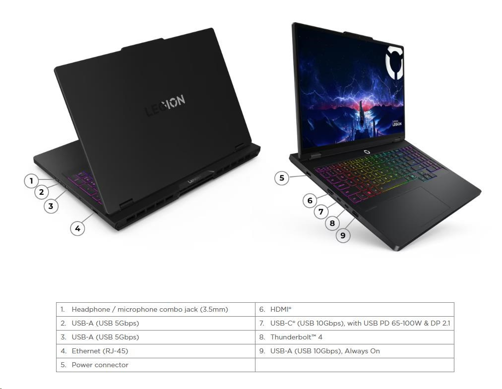 | Standartné porty | 2x USB-A (USB 5Gbps / USB 3.2 Gen 1) 1x USB-A (USB 10Gbps / USB 3.2 Gen 2), Always On 1x USB-C® (USB 10Gbps / USB 3.2 Gen 2), with USB PD 65-100W and DisplayPort™ 2.1 1x USB-C® (Thunderbolt™ 4 / USB4® 40Gbps), with DisplayPort™ 2.1 1x HDMI® 2.1, up to 8K/60Hz 1x Headphone / microphone combo jack (3.5mm) 1x Ethernet (RJ-45) 1x Slim tip Power connector |