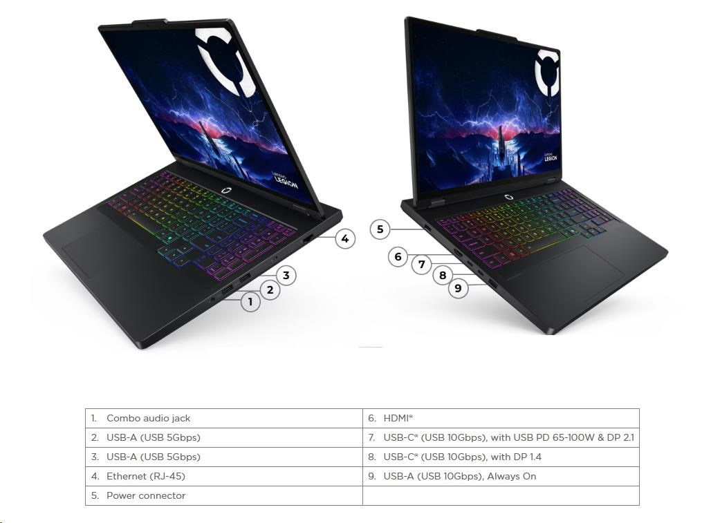 | Standartné porty | 2x USB-A (USB 5Gbps / USB 3.2 Gen 1) 1x USB-A (USB 10Gbps / USB 3.2 Gen 2), Always On 1x USB-C® (USB 10Gbps / USB 3.2 Gen 2), with USB PD 65-100W and DisplayPort™ 2.1 1x USB-C® (USB 10Gbps / USB 3.2 Gen 2), with DisplayPort™ 1.4 1x HDMI® 2.1, up to 8K/60Hz 1x Headphone / microphone combo jack (3.5mm) 1x Ethernet (RJ-45) 1x Power connector |