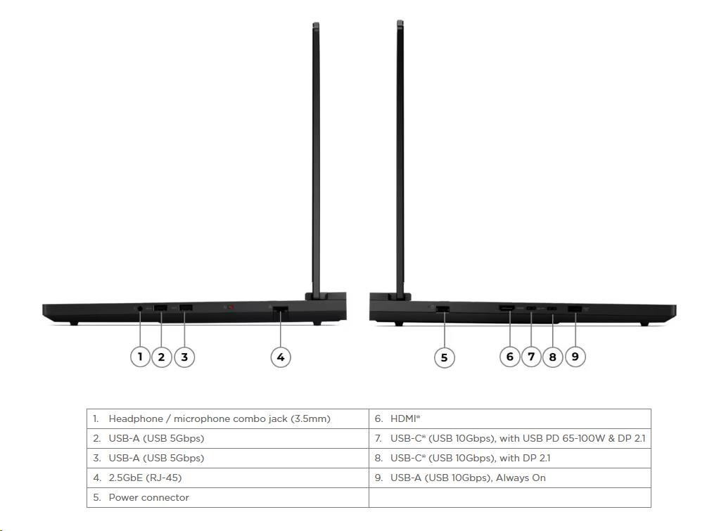 Standartné porty | 2x USB-A (USB 5Gbps / USB 3.2 Gen 1) 1x USB-A (USB 10Gbps / USB 3.2 Gen 2), Always On 1x USB-C® (USB 10Gbps / USB 3.2 Gen 2), with DisplayPort™ 2.1 1x USB-C® (USB 10Gbps / USB 3.2 Gen 2), with USB PD 65-100W and DisplayPort™ 2.1 1x HDMI® 2.1, up to 8K/60Hz 1x Headphone / microphone combo jack (3.5mm) 1x Ethernet (2.5GbE RJ-45) 1x Power connector |