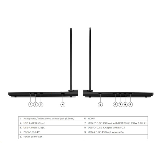 | Standartné porty | 1x USB-A (USB 5Gbps / USB 3.2 Gen 1) 1x USB-A (USB 5Gbps / USB 3.2 Gen 1), Always On 1x USB-C® (USB 5Gbps / USB 3.2 Gen 1) 1x USB-C® (USB 10Gbps / USB 3.2 Gen 2), with PD 140W and DisplayPort™ 1.4 1x USB-C® (Thunderbolt™ 4 / USB4® 40Gbps), with PD 140W and DisplayPort™ 1.4 1x HDMI® 2.1, up to 8K/60Hz 1x Headphone / microphone combo jack (3.5mm) 1x Card reader 1x Power connector |