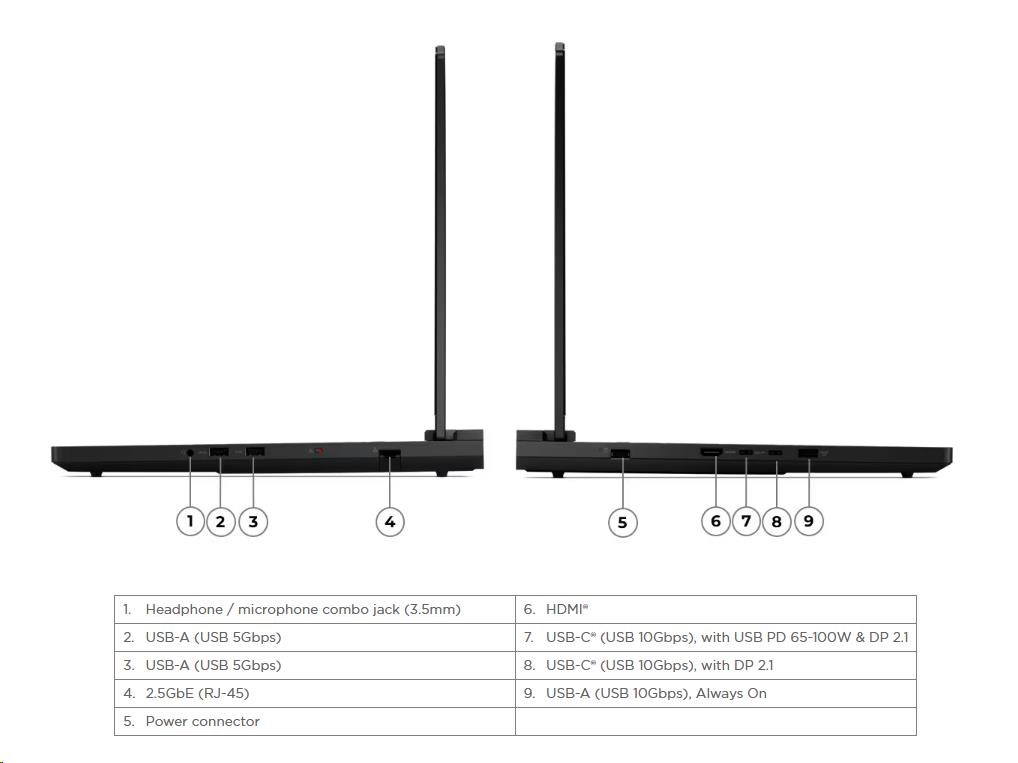 Standartné porty | 1x USB-A (USB 5Gbps / USB 3.2 Gen 1) 1x USB-A (USB 5Gbps / USB 3.2 Gen 1), Always On 1x USB-C® (USB 5Gbps / USB 3.2 Gen 1) 1x USB-C® (USB 10Gbps / USB 3.2 Gen 2), with PD 140W and DisplayPort™ 1.4 1x USB-C® (Thunderbolt™ 4 / USB4® 40Gbps), with PD 140W and DisplayPort™ 1.4 1x HDMI® 2.1, up to 8K/60Hz 1x Headphone / microphone combo jack (3.5mm) 1x Card reader 1x Power connector |
