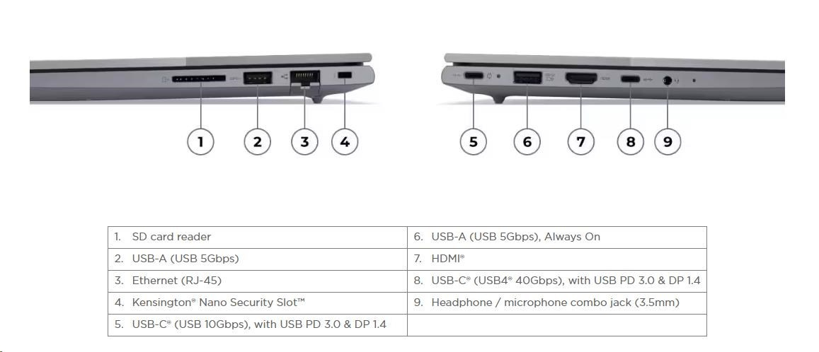 | Standartné porty | 1x USB-A (USB 5Gbps / USB 3.2 Gen 1) 1x USB-A (USB 5Gbps / USB 3.2 Gen 1), Always On 1x USB-C® (USB 10Gbps / USB 3.2 Gen 2), with USB PD 3.0 and DisplayPort™ 1.4 1x USB-C® (USB4® 40Gbps), with USB PD 3.0 and DisplayPort™ 1.4 1x HDMI® 2.1, up to 4K/60Hz 1x Headphone / microphone combo jack (3.5mm) 1x Ethernet (RJ-45) 1x SD card reader |