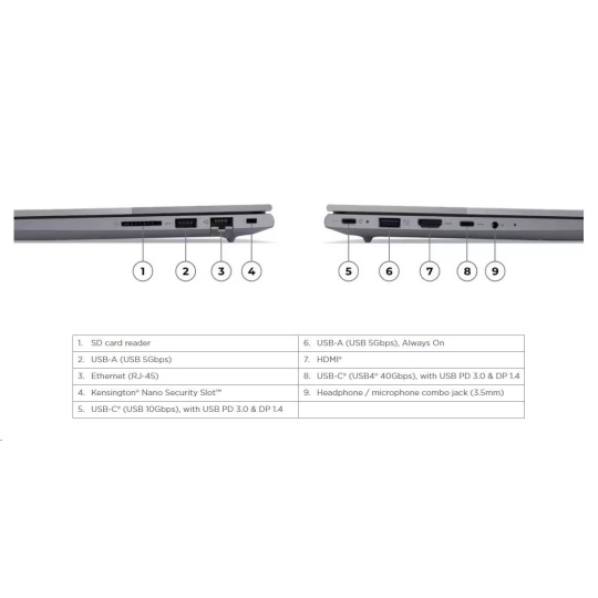 | Standartné porty | 1x USB-A (USB 5Gbps / USB 3.2 Gen 1) 1x USB-A (USB 5Gbps / USB 3.2 Gen 1), Always On 1x USB-C® (USB 10Gbps / USB 3.2 Gen 2), with USB PD 3.0 and DisplayPort™ 1.4 1x USB-C® (USB4® 40Gbps), with USB PD 3.0 and DisplayPort™ 1.4 1x HDMI® 2.1, up to 4K/60Hz 1x Headphone / microphone combo jack (3.5mm) 1x Ethernet (RJ-45) 1x SD card reader |