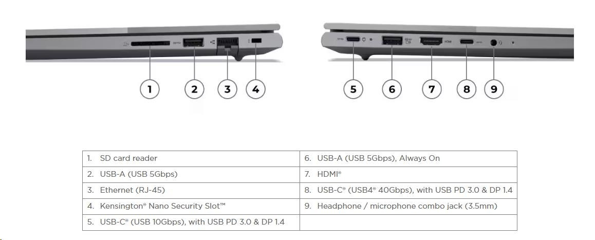 | Standartné porty | 1x USB-A (USB 5Gbps / USB 3.2 Gen 1) 1x USB-A (USB 5Gbps / USB 3.2 Gen 1), Always On 1x USB-C® (USB 10Gbps / USB 3.2 Gen 2), with USB PD 3.0 and DisplayPort™ 1.4 1x USB-C® (USB4® 40Gbps), with USB PD 3.0 and DisplayPort™ 1.4 1x HDMI® 2.1, up to 4K/60Hz 1x Headphone / microphone combo jack (3.5mm) 1x Ethernet (RJ-45) 1x SD card reader |