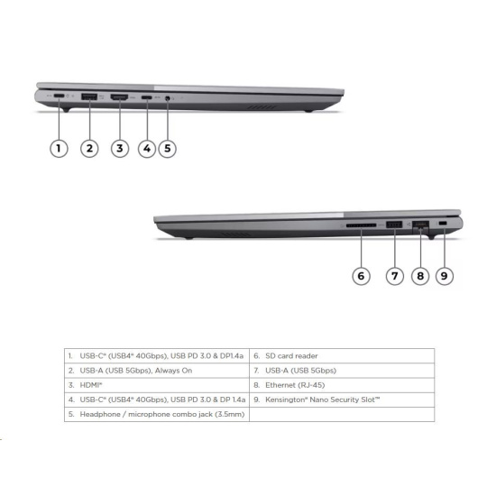 | Standartné porty | 1x USB-A (USB 5Gbps), Always On 1x USB-A (USB 5Gbps) 2x USB-C® (USB4® 40Gbps), with USB PD 3.0 and DisplayPort™ 1.4a 1x HDMI® 2.1, up to 4K/60Hz 1x Headphone / microphone combo jack (3.5mm) 1x Ethernet (RJ-45) 1x SD card reader |