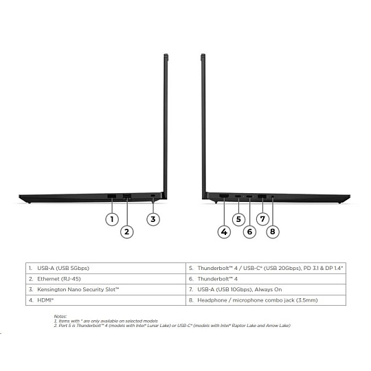 | Standartné porty | 1x USB-A (USB 5Gbps / USB 3.2 Gen 1) 1x USB-A (USB 10Gbps / USB 3.2 Gen 2), Always On 1x USB-C® (Thunderbolt™ 4 / USB4® 40Gbps), with USB PD 45-65W and DisplayPort™ 2.1 1x HDMI® 2.1, up to 4K/60Hz 1x Headphone / microphone combo jack (3.5mm) 1x Ethernet (RJ-45) Optional Ports (configured) 1x USB-C® (Thunderbolt™ 4 / USB4® 40Gbps), with USB PD 45-65W and DisplayPort™ 2.1 |