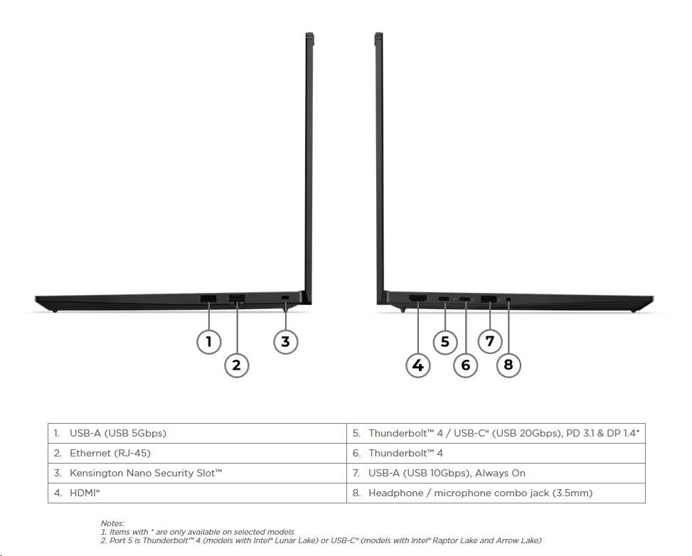 | Standartné porty | 1x USB-A (USB 5Gbps / USB 3.2 Gen 1) 1x USB-A (USB 10Gbps / USB 3.2 Gen 2), Always On 1x USB-C® (Thunderbolt™ 4 / USB4® 40Gbps), with USB PD 45-65W and DisplayPort™ 2.1 1x HDMI® 2.1, up to 4K/60Hz 1x Headphone / microphone combo jack (3.5mm) 1x Ethernet (RJ-45) Optional Ports (configured) 1x USB-C® (Thunderbolt™ 4 / USB4® 40Gbps), with USB PD 45-65W and DisplayPort™ 2.1 |