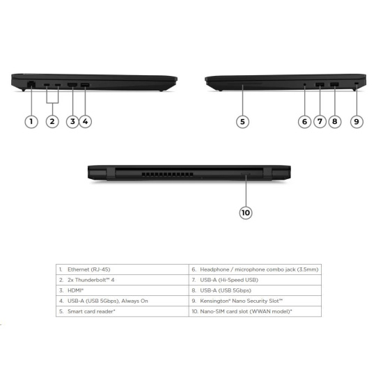| Standartné porty | 1x USB-A (Hi-Speed USB / USB 2.0) 2x USB-A (USB 5Gbps / USB 3.2 Gen 1), one Always On 2x USB-C® (Thunderbolt™ 4 / USB4® 40Gbps), with USB PD 3.1 and DisplayPort™ 1.4a 1x HDMI® 2.1, up to 4K/60Hz 1x Headphone / microphone combo jack (3.5mm) 1x Ethernet (RJ-45) Optional Ports (configured) 1x Smart Card Reader 1x Nano-SIM Card Slot |