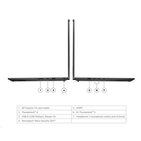 | Standartné porty | 1x USB-A (USB 10Gbps / USB 3.2 Gen 2), Always On 2x Thunderbolt™ 5, with USB PD 3.1 and DisplayPort™ 2.1, 140W input / 15W outpu 1x Thunderbolt™ 4, with DisplayPort™ 2.1 and USB PD 3.1, 140W input / 15W output 1x HDMI® 2.1, up to 8K/60Hz 1x Headphone / microphone combo jack (3.5mm) 1x SD Express 7.0 card reader |