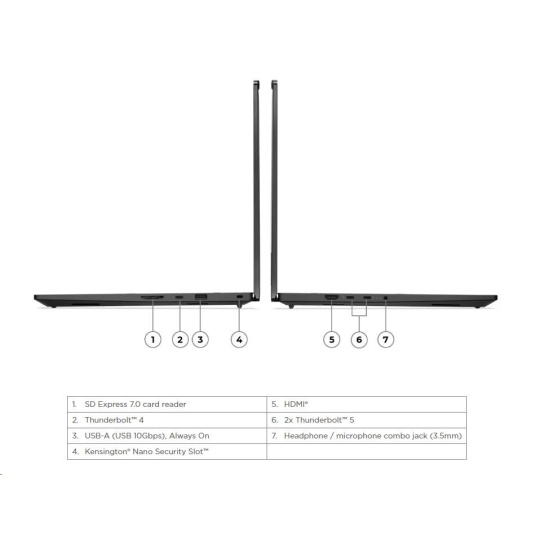 | Standartné porty | 1x USB-A (USB 10Gbps / USB 3.2 Gen 2), Always On 2x Thunderbolt™ 5, with USB PD 3.1 and DisplayPort™ 2.1, 140W input / 15W outpu 1x Thunderbolt™ 4, with DisplayPort™ 2.1 and USB PD 3.1, 140W input / 15W output 1x HDMI® 2.1, up to 8K/60Hz 1x Headphone / microphone combo jack (3.5mm) 1x SD Express 7.0 card reader |