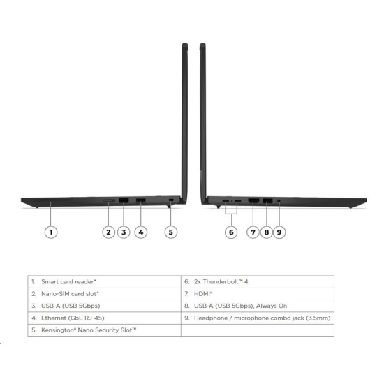 | Standartné porty | 1x USB-A (USB 5Gbps / USB 3.2 Gen 1) 1x USB-A (USB 5Gbps / USB 3.2 Gen 1), Always On 2x USB-C® (Thunderbolt™ 4 / USB4® 40Gbps), with PD 3.0 and DisplayPort™ 1.4 1x HDMI® 2.1, up to 4K/60Hz 1x Headphone / microphone combo jack (3.5mm) 1x Ethernet (RJ-45) 1x Security keyhole |