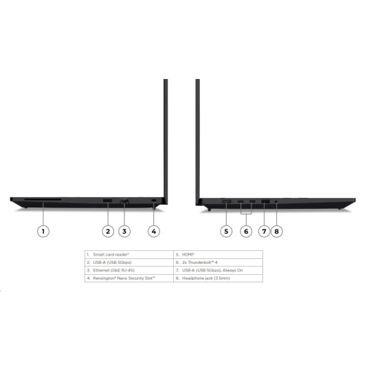 | Standartné porty | 1x USB-A (USB 5Gbps / USB 3.2 Gen 1) 1x USB-A (USB 5Gbps / USB 3.2 Gen 1), Always On 2x Thunderbolt™ 4, with USB PD 3.0 1x HDMI® 2.1, up to 4K/60Hz 1x Headphone / microphone combo jack (3.5mm) 1x Ethernet (GbE RJ-45) 1x Security keyhole 1x Smart Card Reader |
