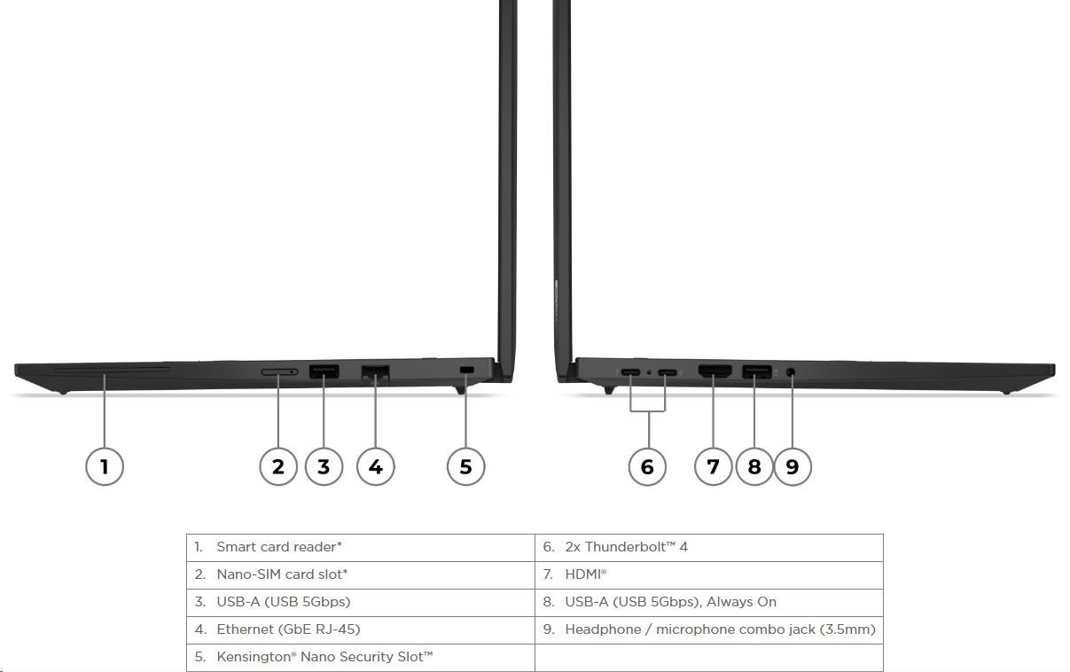 Standartné porty | 1x USB-A (USB 5Gbps / USB 3.2 Gen 1) 1x USB-A (USB 5Gbps / USB 3.2 Gen 1), Always On 2x USB-C® (Thunderbolt™ 4 / USB4® 40Gbps), with USB PD 3.0 and DisplayPort™ 1.4 1x HDMI® 2.1, up to 4K/60Hz 1x Headphone / microphone combo jack (3.5mm) 1x Ethernet (RJ-45) 1x Security keyhole |