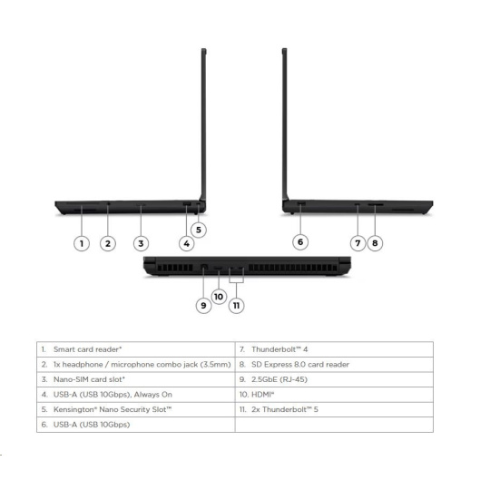 | Standartné porty | 1x USB-A (USB 10Gbps / USB 3.2 Gen 2), Always On 1x USB-A (USB 10Gbps / USB 3.2 Gen 2) 2x Thunderbolt™ 5, with DisplayPort™ 2.1 and USB PD 3.1, 180W input / 15W output 1x Thunderbolt™ 4, with DisplayPort™ 2.1 and USB PD 3.1, 180W input / 15W output 1x HDMI® 2.1, up to 8K/60Hz 1x Headphone / microphone combo jack (3.5mm) 1x Ethernet (2.5GbE RJ-45) 1x SD Express 8.0 card reader |