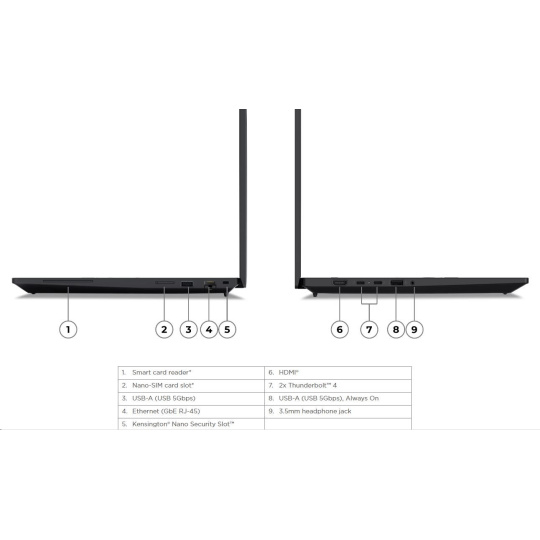 | Standartné porty | 1x USB-A (USB 5Gbps / USB 3.2 Gen 1) 1x USB-A (USB 5Gbps / USB 3.2 Gen 1), Always On 2x USB-C® (Thunderbolt™ 4 / USB4® 40Gbps), with USB PD 3.0 and DisplayPort™ 2.1 1x HDMI® 2.1, up to 4K/60Hz 1x Headphone / microphone combo jack (3.5mm) 1x Ethernet (RJ-45) 1x Security keyhole |