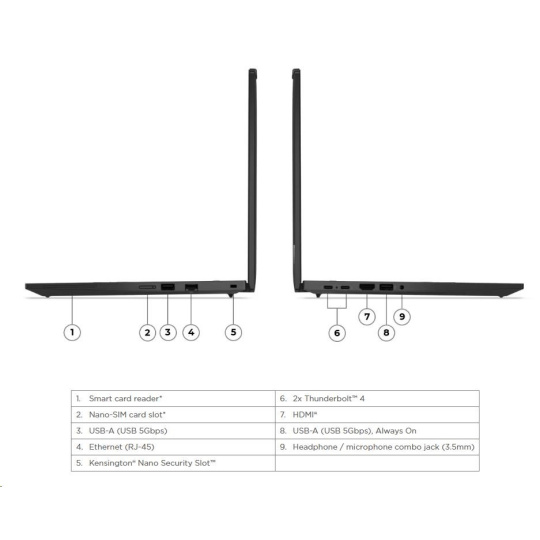 | Standartné porty | 1x USB-A (USB 5Gbps / USB 3.2 Gen 1) 1x USB-A (USB 5Gbps / USB 3.2 Gen 1), Always On 2x USB-C® (Thunderbolt™ 4 / USB4® 40Gbps), with USB PD 3.0 and DisplayPort™ 2.1 1x HDMI® 2.1, up to 4K/60Hz 1x Headphone / microphone combo jack (3.5mm) 1x Ethernet (RJ-45) 1x Smart Card Reader 1x Nano-SIM Card Slot |