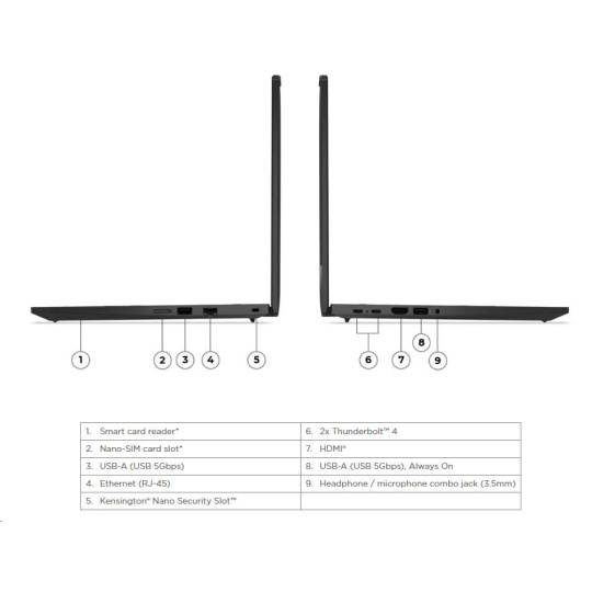 | Standartné porty | 1x USB-A (USB 5Gbps / USB 3.2 Gen 1) 1x USB-A (USB 5Gbps / USB 3.2 Gen 1), Always On 2x USB-C® (Thunderbolt™ 4 / USB4® 40Gbps), with USB PD 3.0 and DisplayPort™ 2.1 1x HDMI® 2.1, up to 4K/60Hz 1x Headphone / microphone combo jack (3.5mm) 1x Ethernet (RJ-45) |