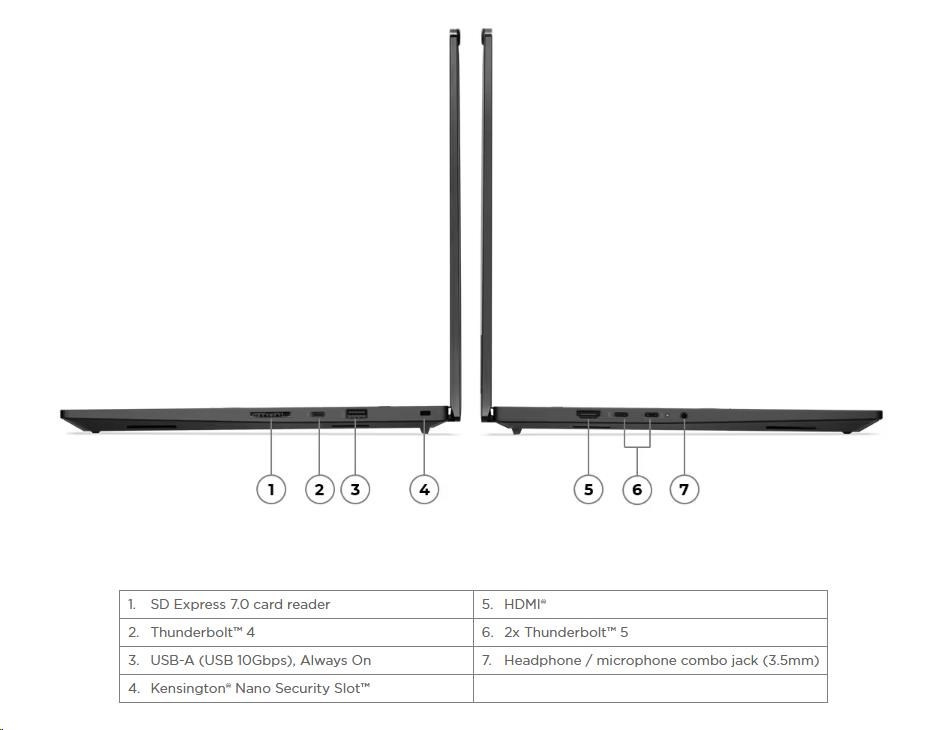 | Standartné porty | 1x USB-A (USB 10Gbps / USB 3.2 Gen 2), Always On 2x Thunderbolt™ 5, with USB PD 3.1 and DisplayPort™ 2.1, 140W input / 15W outpu 1x Thunderbolt™ 4, with DisplayPort™ 2.1 and USB PD 3.1, 140W input / 15W output 1x HDMI® 2.1, up to 8K/60Hz 1x Headphone / microphone combo jack (3.5mm) 1x SD Express 7.0 card reader |