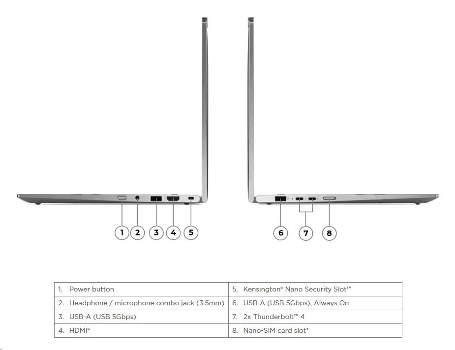 | Standartné porty | 1x USB-A (USB 5Gbps / USB 3.2 Gen 1) 1x USB-A (USB 5Gbps / USB 3.2 Gen 1), Always On 2x USB-C® (Thunderbolt™ 4 / USB4® 40Gbps), with USB PD 3.0 and DisplayPort™ 2.1 1x HDMI® 2.1, up to 4K/60Hz 1x Headphone / microphone combo jack (3.5mm) 1x Nano-SIM Card Slot |