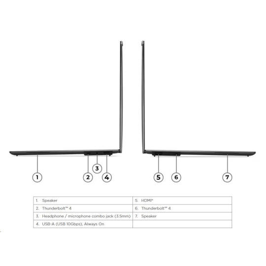 | Standartné porty | 1x USB-A (USB 10Gbps / USB 3.2 Gen 2), Always On 2x USB-C® (Thunderbolt™ 4 / USB4® 40Gbps), with USB PD 3.0 and DisplayPort™ 2.1 1x HDMI® 2.1, up to 4K/60Hz 1x Headphone / microphone combo jack (3.5mm) |