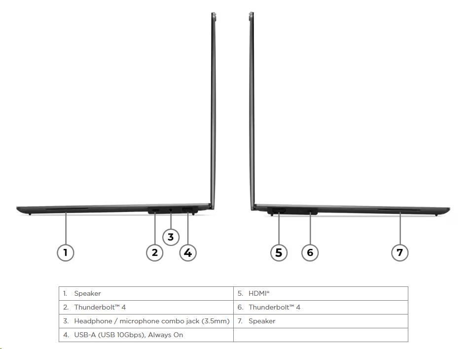 | Standartné porty | 1x USB-A (USB 10Gbps / USB 3.2 Gen 2), Always On 2x USB-C® (Thunderbolt™ 4 / USB4® 40Gbps), with USB PD 3.0 and DisplayPort™ 2.1 1x HDMI® 2.1, up to 4K/60Hz 1x Headphone / microphone combo jack (3.5mm) |