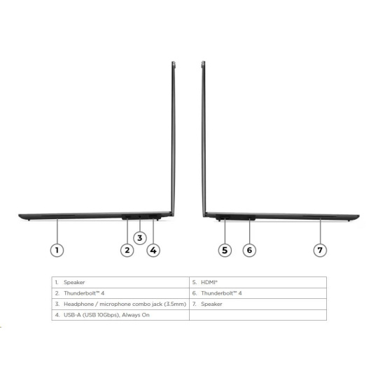 | Štandardné porty | 1x USB-A (USB 10Gbps / USB 3.2 Gen 2), Always On 2x USB-C® (Thunderbolt™ 4 / USB4® 40Gbps), s USB PD 3.0 a DisplayPort™ 2.1 1x HDMI® 2.1, až do 4K/60Hz 1x kombinovaný Jack pre slúchadlá / mikrofón (3.5mm) |