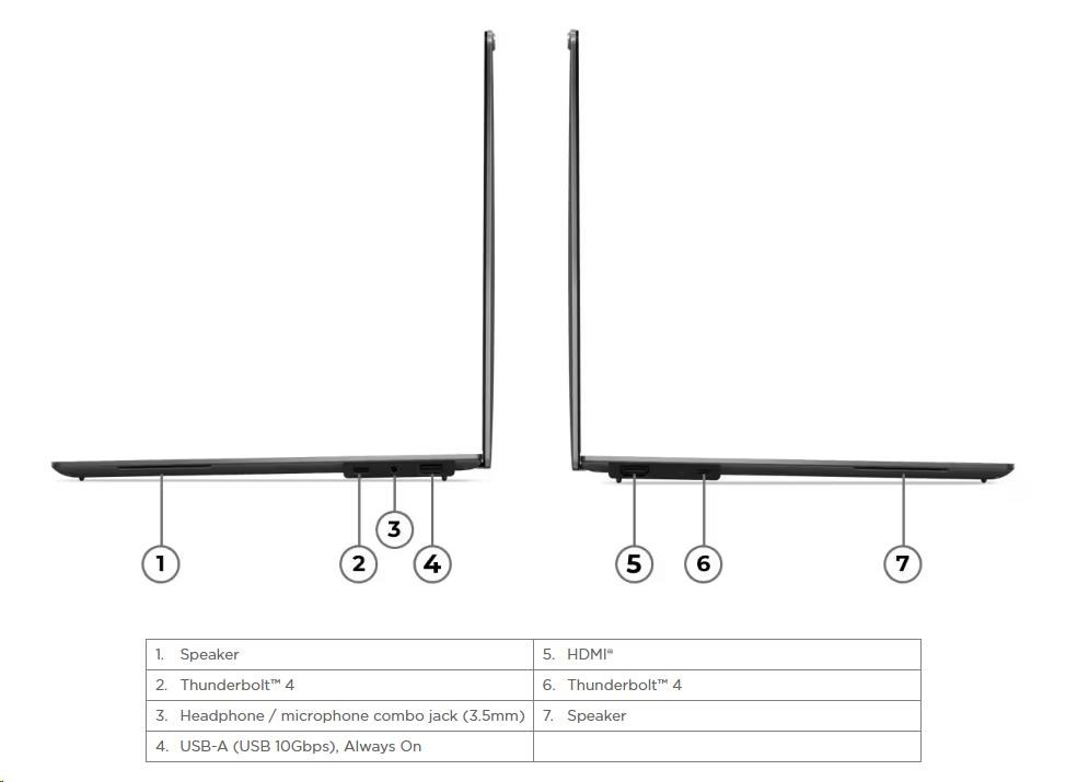 | Štandardné porty | 1x USB-A (USB 10Gbps / USB 3.2 Gen 2), Always On 2x USB-C® (Thunderbolt™ 4 / USB4® 40Gbps), s USB PD 3.0 a DisplayPort™ 2.1 1x HDMI® 2.1, až do 4K/60Hz 1x kombinovaný Jack pre slúchadlá / mikrofón (3.5mm) |