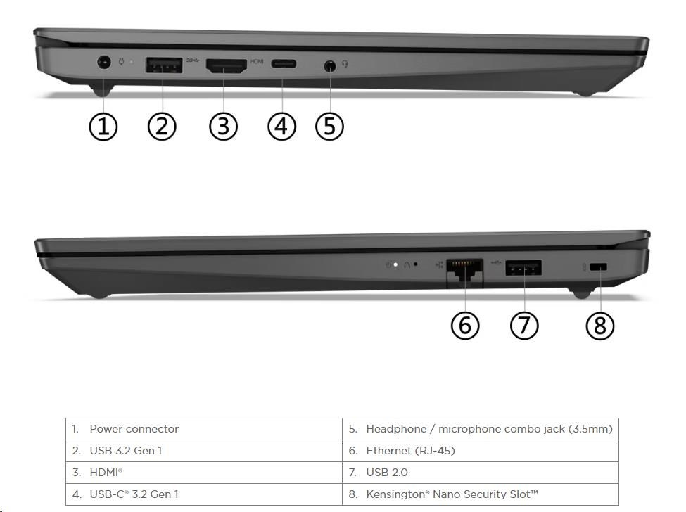 Standartné porty | 1x USB 2.0 1x USB 3.2 Gen 1 1x USB-C® 3.2 Gen 1 (support data transfer, Power Delivery 3.0 and DisplayPort™ 1.2) 1x HDMI® 1.4b 1x Headphone / microphone combo jack (3.5mm) 1x Ethernet (RJ-45) 1x Power connector |