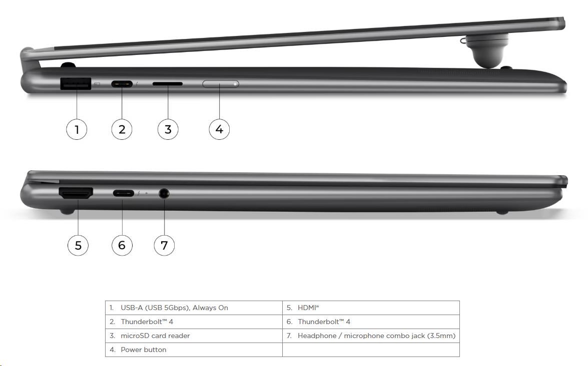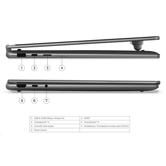 | Standartné porty | 1x USB-A (USB 5Gbps), Always On 2x Thunderbolt™ 4, with USB PD 45-65W and DisplayPort™ 2.1 1x HDMI® 2.1, up to 4K/60Hz 1x Headphone / microphone combo jack (3.5mm) 1x microSD card reader |