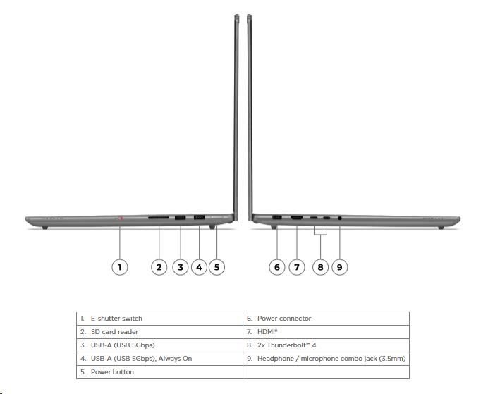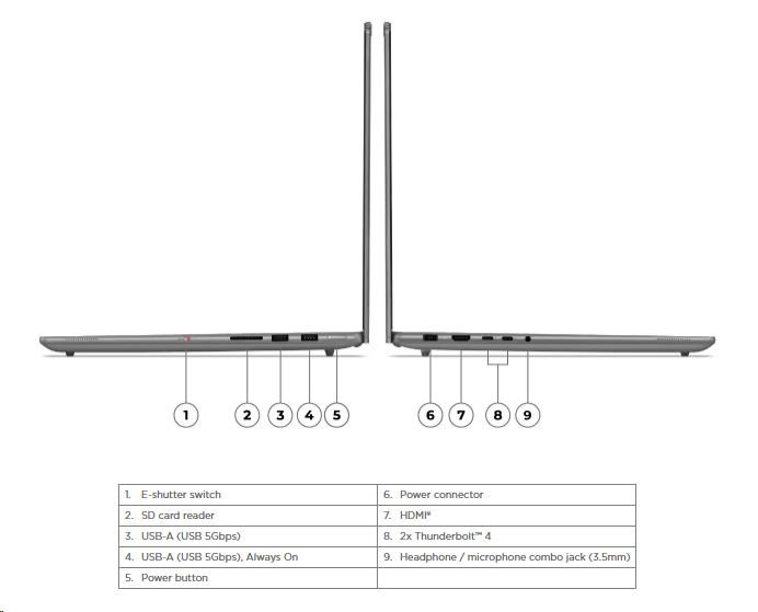 | Standartné porty | 1x USB-A (USB 5Gbps / USB 3.2 Gen 1) 1x USB-A (USB 5Gbps / USB 3.2 Gen 1), Always On 2x USB-C® (Thunderbolt™ 4 / USB4® 40Gbps), with USB PD 65-100W and DisplayPort™ 2.1 1x HDMI® 2.1, up to 8K/60Hz 1x Headphone / microphone combo jack (3.5mm) 1x SD card reader 1x Power connector |
