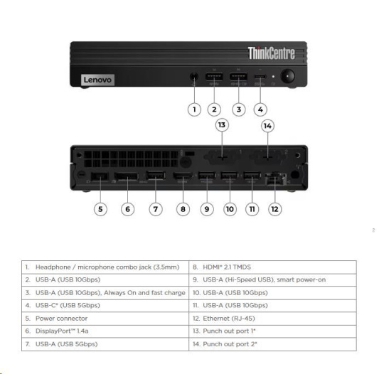 | Predné porty | 1x USB-C® (USB 5Gbps / USB 3.2 Gen 1), with 5V@0.9A charging 1x USB-A (USB 10Gbps / USB 3.2 Gen 2), with Always On and 5V@2.1A charging 1x USB-A (USB 10Gbps / USB 3.2 Gen 2) 1x headphone / microphone combo jack (3.5mm) |