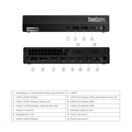 | Predné porty | 1x USB-C® (USB 10Gbps / USB 3.2 Gen 2), data transfer only 1x USB-A (USB 10Gbps / USB 3.2 Gen 2), with Always On and 5V@2.1A charging 1x USB-A (USB 10Gbps / USB 3.2 Gen 2) 1x headphone / microphone combo jack (3.5mm) |