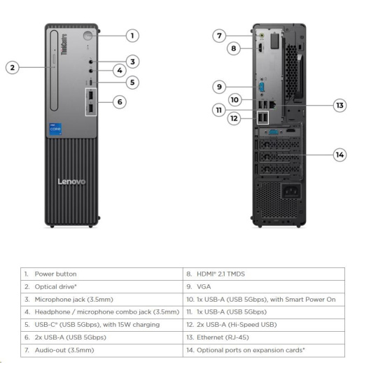 | Zadné porty | 2x USB-A (Hi-Speed USB / USB 2.0) 2x USB-A (USB 5Gbps / USB 3.2 Gen 1), one supports Smart Power On 1x HDMI® 2.1 TMDS 1x VGA 1x Ethernet (RJ-45) 1x line-out (3.5mm) |