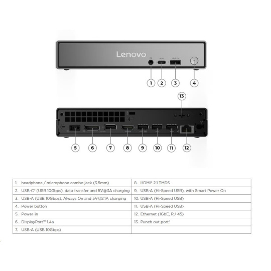| Predné porty | 1x USB-C® (USB 10Gbps / USB 3.2 Gen 2), with data transfer and 5V@3A charging 1x USB-A (USB 10Gbps / USB 3.2 Gen 2), with Always On and 5V@2.1A charging 1x headphone / microphone combo jack (3.5mm) |