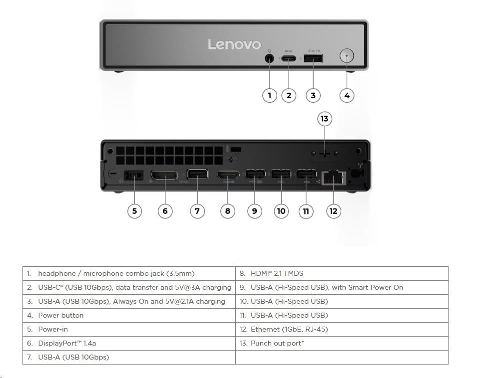 | Predné porty | 1x USB-C® (USB 10Gbps / USB 3.2 Gen 2), with data transfer and 5V@3A charging 1x USB-A (USB 10Gbps / USB 3.2 Gen 2), with Always On and 5V@2.1A charging 1x headphone / microphone combo jack (3.5mm) |