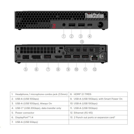 | Predné porty | 1x USB-C® (USB 20Gbps / USB 3.2 Gen 2x2), data transfer only 1x USB-A (USB 10Gbps / USB 3.2 Gen 2), Always On 1x USB-A (USB 10Gbps / USB 3.2 Gen 2) 1x headphone / microphone combo jack (3.5mm) |