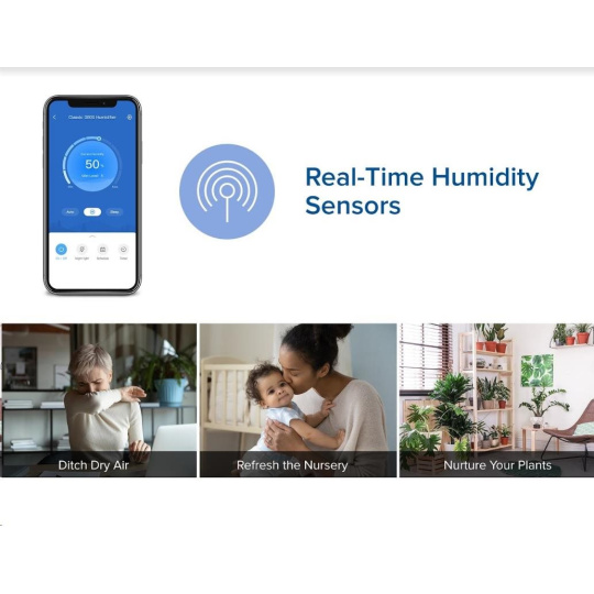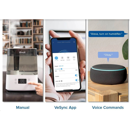 Zvlhčovač vzduchu Levoit Classic300S Smart je možné ovládať priamo na prehľadnom podsvietenom LED displeji alebo aj cez aplikáciu na chytrých zariadeniach Apple alebo Android. Alebo si ho môžete dokonca pripojiť do svojho Smart Home a ovládať hlasom cez Google Assistant alebo Amazon Alexa. Senzor vlhkosti zobrazuje vlhkosť v reálnom čase av automatickom režime tak okamžite reaguje na zmeny vlhkosti. Vždy by sa malo jednať o rozmedzie medzi 40 % až 60 %. Cez aplikáciu si môžete informácie kontrolovať alebo si svoje režimy plánovať.
