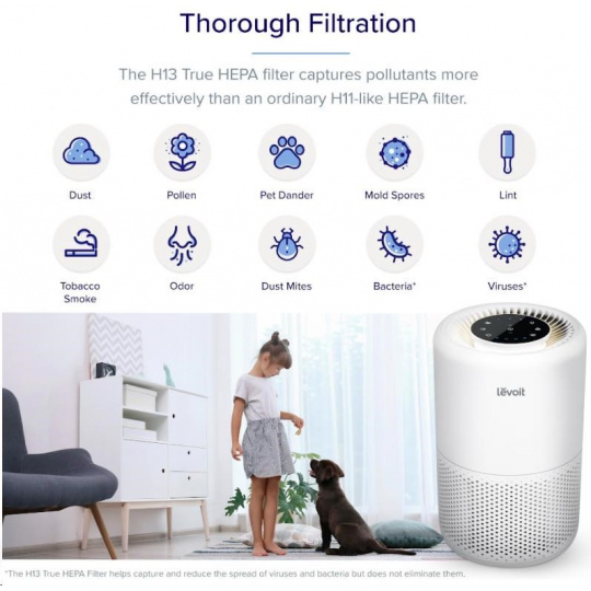 Druhou vrstvou je HEPA filter H13. To odlišuje Levoit od konkurencie, pretože filter HEPA H13 je oveľa kvalitnejší a spoľahlivejší ako bežne používané HEPA H11. Tu sa odfiltrujú jemné prachové častice, pleseň, baktérie, peľ, dymové častice, roztoče a srsť.