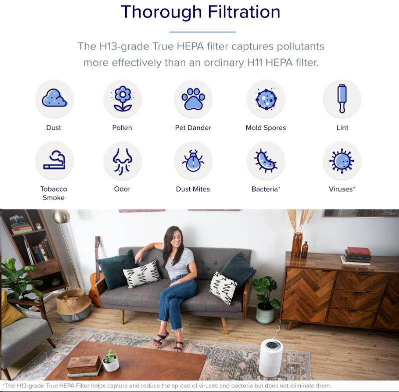 Druhou vrstvou je HEPA filter H13. To odlišuje Levoit od konkurencie, pretože filter HEPA H13 je oveľa kvalitnejší a spoľahlivejší ako bežne používané HEPA H11. Tu sa odfiltrujú jemné prachové častice, pleseň, baktérie, peľ, dymové častice, roztoče a srsť.