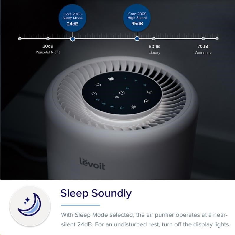 Vďaka patentovanej technológii QuietKEAPTM ani nebudete vedieť, že je čistička Levoit Core 200S v prevádzke. Pri najvyššom výkone dosahuje už aj tak nízku hlučnosť 45dB. Pre nerušený spánok sa priamo ponúka nočný režim, v ktorom je hlučnosť ešte nižšia - 24 dB. V nočnom režime sa tiež aktivuje tlmené osvetlenie a môžete si vypnúť podsvietenie ikoniek.