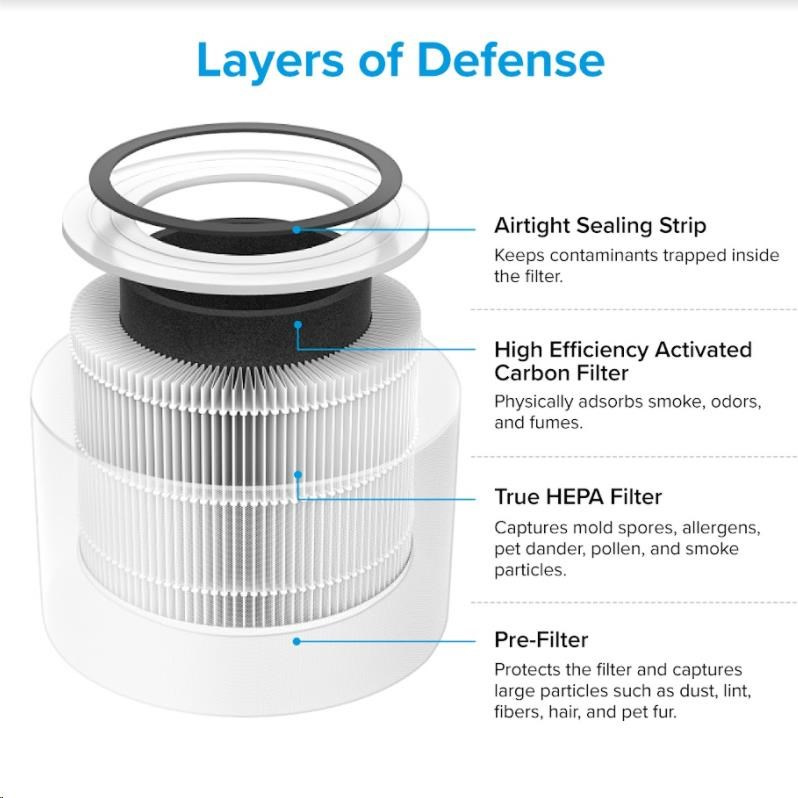 Druhou vrstvou je HEPA filter H13. To odlišuje Levoit od konkurencie, pretože filter HEPA H13 je oveľa kvalitnejší a spoľahlivejší ako bežne používané HEPA H11. Tu sa odfiltrujú jemné prachové častice, pleseň, baktérie, peľ, dymové častice, roztoče a srsť.