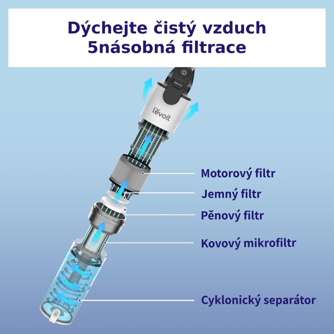 Vysávač Levoit LVAC200 je vybavený 5-násobným filtračným systémom, ktorý dokáže zachytiť až 99,99 % nečistôt zanechaných domácimi zvieratami a až 98 % bežných nečistôt s veľkosťou od 0,3 mikrónov. Vďaka tomu je vzduch, ktorý doma dýchate, zbavený nečistôt, ktoré by inak pri dlhodobom vystavení mohli viesť k zdravotným problémom.