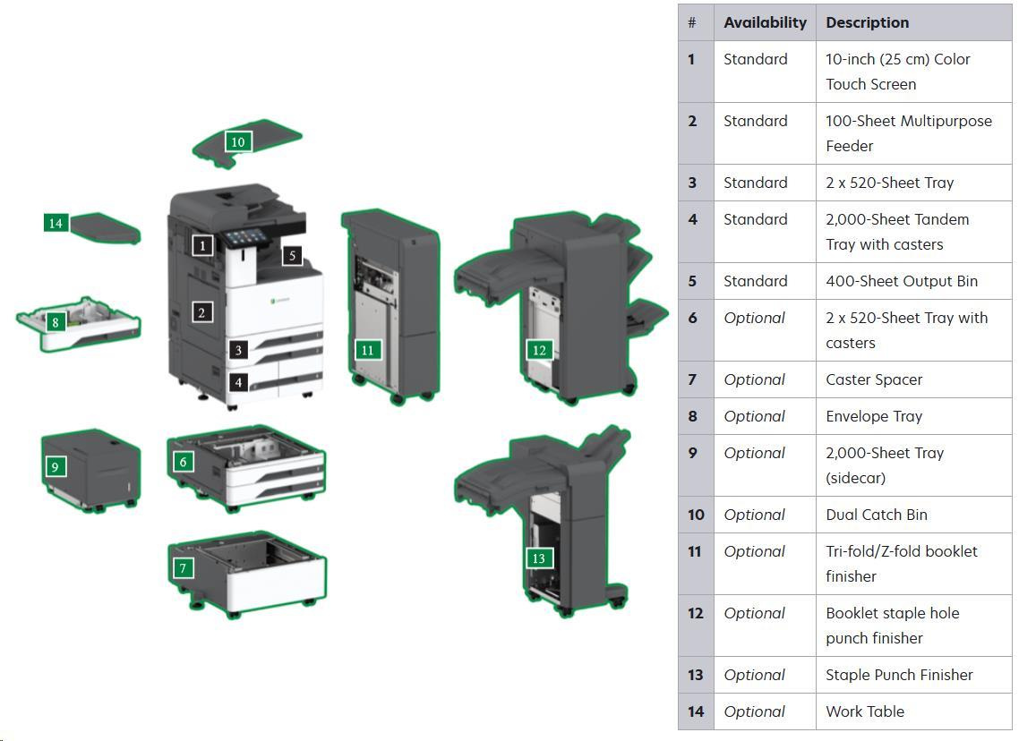 Funkcie: Lexmark e-Task 10" (25 cm) farebný dotykový displej, Farebný laser, Farebné skenovanie, Farebné sieťové skenovanie, Farebný tlač, Farebné faxovanie, Farebné kopírovanie, Trusted Platform Module (TPM)*, *Modul Trusted Platform Module (TPM) nie je v niektorých krajinách dostupný. - Tlačové náplne dodávané so zariadením: Čierna tonerová kazeta na 18 500* strán, 11 500* - farebné (CMY) tonerové kazety - Duplexný (obojstranný) tlač: Integrovaná duplexná - Pevný disk: Vrátane inteligentného úložného disku; Magnetický pevný disk je k dispozícii - Priame USB: Áno - Rýchlosť tlače (A4, čiernobiele): Až 65 strán / min. 1) - Čas prvej strany (čiernobiele): 4,7 sekundy 1) - Rýchlosť tlače (A4, farebne): Až 65 strán / min. 1) - Pamäť, štandardná: 4096 MB - Maximálny mesačný funkčný cyklus: 340 000 strán za mesiac 2) - Odporúčaný mesačný objem tlače: 7 000 - 50 000 strán 2) - Dotykový displej: Áno - Kapacita vstupu papiera, štandardne: Až 3140 strán - Záručná doba produktu: 1-ročná služba na mieste, Next Business Day