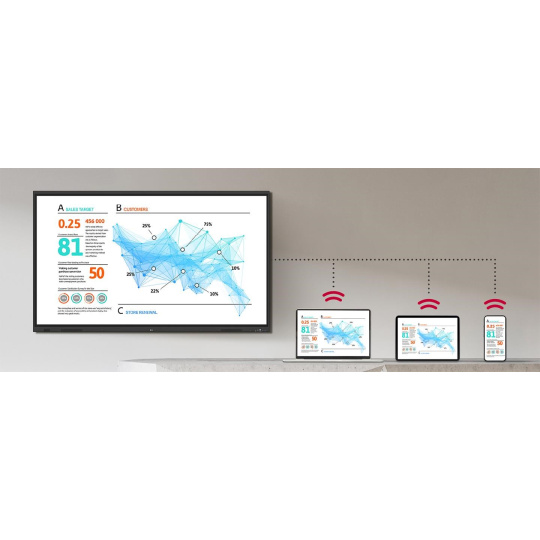 LG CreateBoard Share ponúka funkciu bezdrôtového zdieľania obrazovky, ktorá používateľom poskytuje flexibilné prostredie pre diskusiu. Svoju obrazovku môžu zdieľať zo svojho PC, tabletu alebo smartfónu, čo výrazne zjednodušuje proces zdieľania a spolupráce na tímových projektoch či prezentáciách.