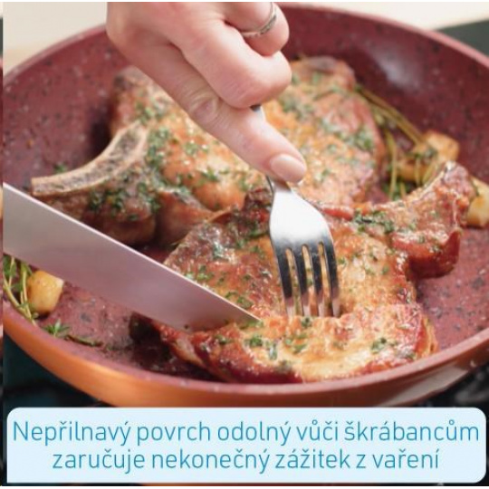 Vďaka neprilnavému povlaku odolnému proti poškriabaniu je zaručený skvelý zážitok z varenia, bez pripálenia čohokoľvek. Šťavnaté steaky, jemné ryby a chrumkavá zelenina môžete pripravovať takmer bez tuku a oleja. Pevné hliníkové jadro vašej Livington Copper & Stone Pan zabezpečuje extrémne rýchle a rovnomerné zohrievanie panvice s nízkou hmotnosťou.
