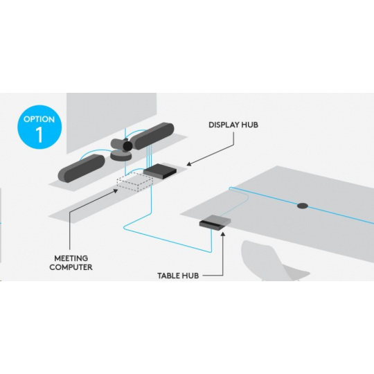 | Káble/napájanie | Kamera > Video Hub Počítač v konferenčnej miestnosti > video/desktop hub Video rozbočovač > Stolný rozbočovač Video Hub > Reproduktor (x2) Počítač v konferenčnej miestnosti > obrazovka (x2) Stolný mikrofón Zásuvka > napájací zdroj (x2) napájací zdroj > rozbočovač video/desktop (x2) |